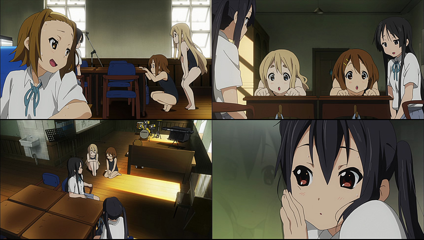 これでまともな練習ができるなと安心する澪だが、即座に涼んだ部室効果によりダレる唯と律。
