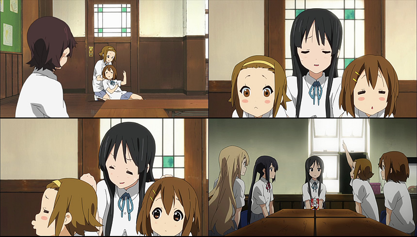 早速、唯と律は和(のどか)のいる生徒会室に行き間接的にクーラーが欲しいことをアピールする三文芝居をするものの、あっさり澪に止められるw